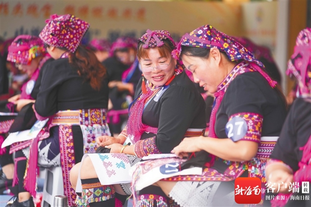 2026年“海南三月三·山海同心圆”锦绣非遗技艺大赛在东方市大田镇“三月三”文化广场举行,选手们比拼苗绣技艺。海南日报全媒体记者 李天平 摄